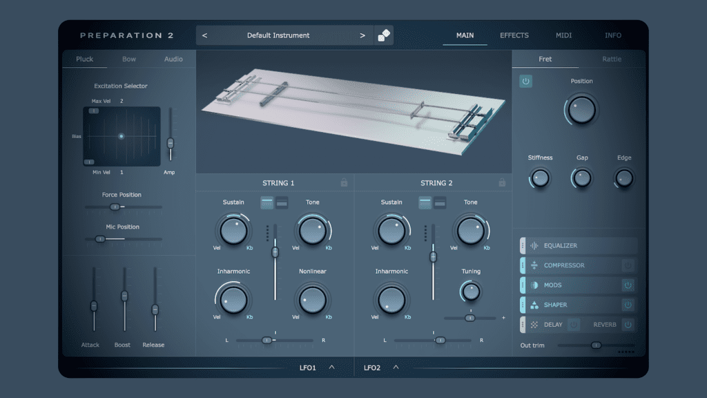 Preparation 2 est donc, comme dit précédemment, un synthétiseur MPE à modélisation physique qui explore la physique des cordes entrant en collision avec un hochet et une frette. Au menu : 7 voix de polyphonie la modélisation physique de 2 cordes entrant en collision avec un hochet et une frette dynamique 3 manières […]